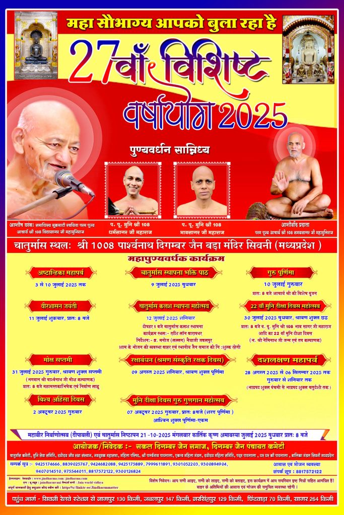 चातुर्मास स्थल :* श्री 1008 पार्श्वनाथ दिगम्बर जैन बड़ा मंदिर सिवनी (मध्य प्रदेश)