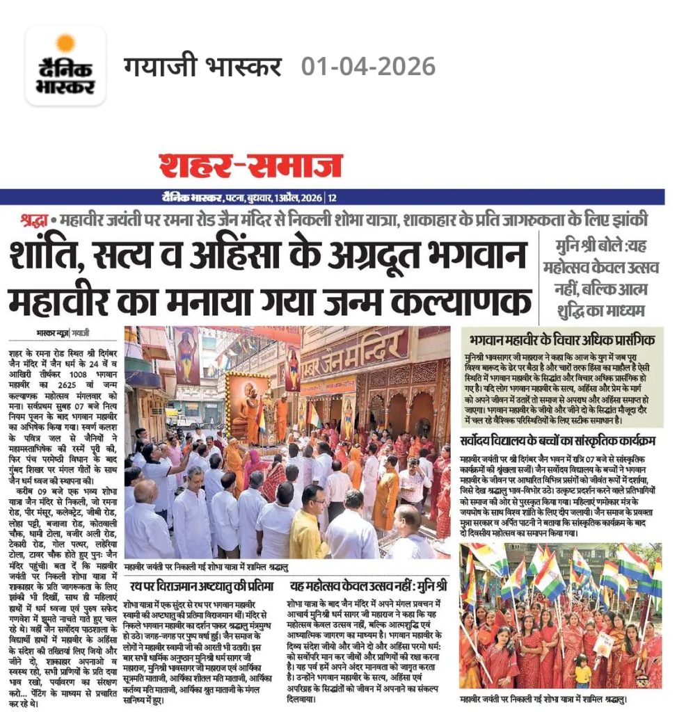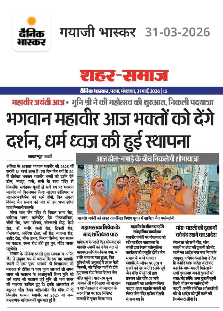 मुनि श्री भाव सागर जी महाराज के सानिध्य में श्री दिगंबर जैन , धर्मशाला गया जी (बिहार) में 31मार्च2026 को महावीर भगवान (जयंती) जन्म कल्याणक महोत्सव, के अंतर्गत रात्रि की बेला में बिहार विधानसभा के अध्यक्ष डॉ. श्री प्रेम कुमार जी शामिल हुए,0 उन्होंने मुनि श्री भावसागर जी महाराज के दर्शन भी किए,पाठशाला के बच्चों ने सांस्कृतिक प्रस्तुतियां दी,